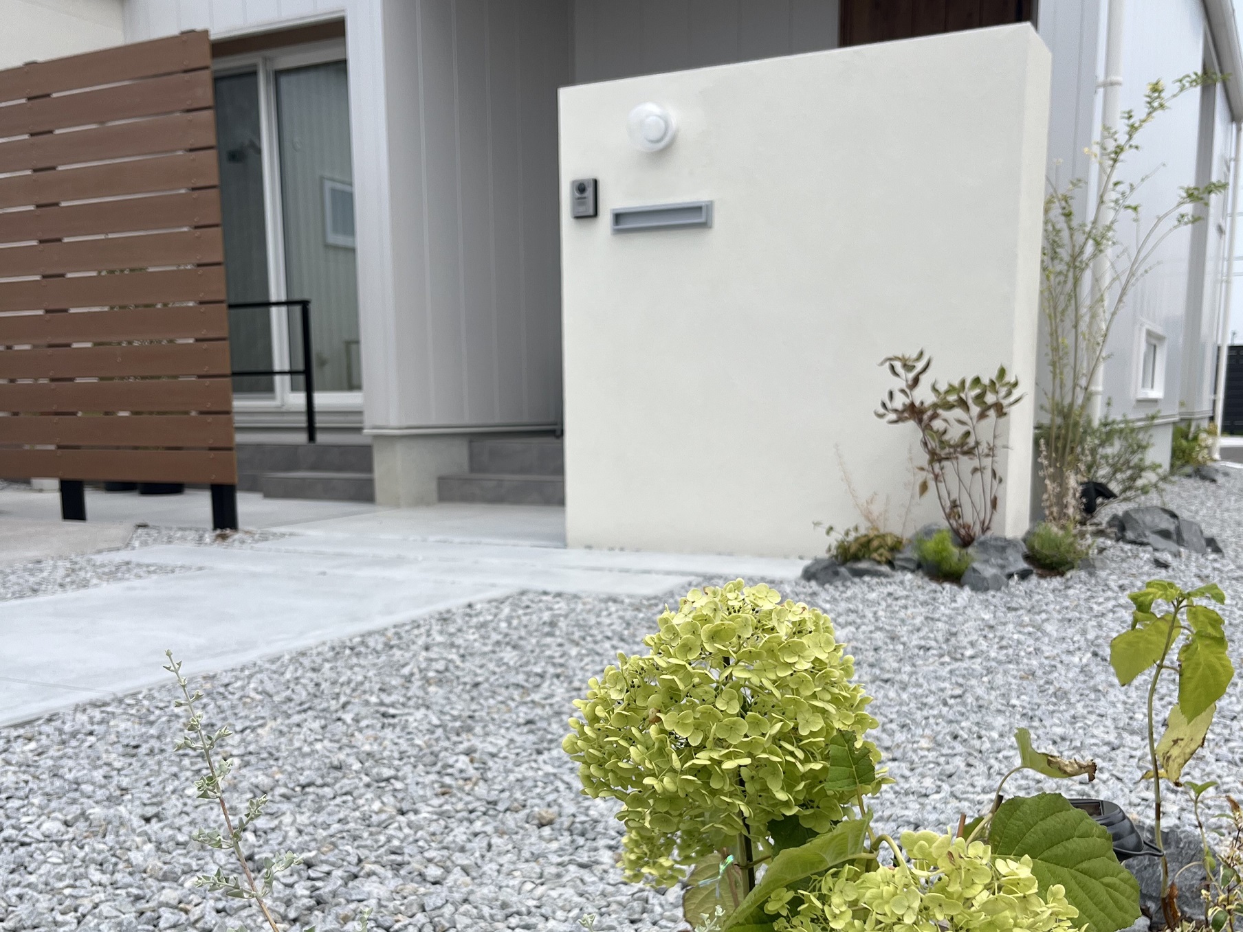 玄関ドアの色と合わせた目隠し樹脂フェンス、エクステリア空間に、「木の香り」をとりいれて心地よさをあたえてくれます。