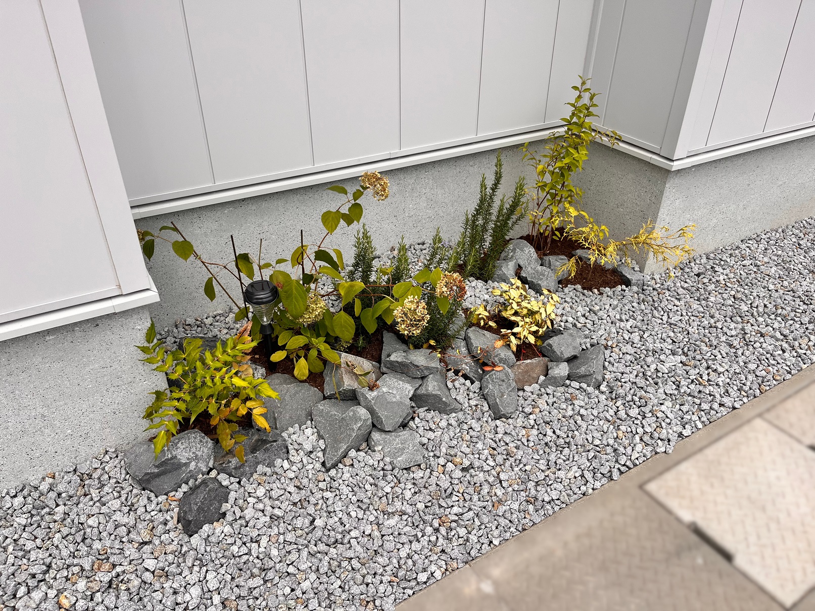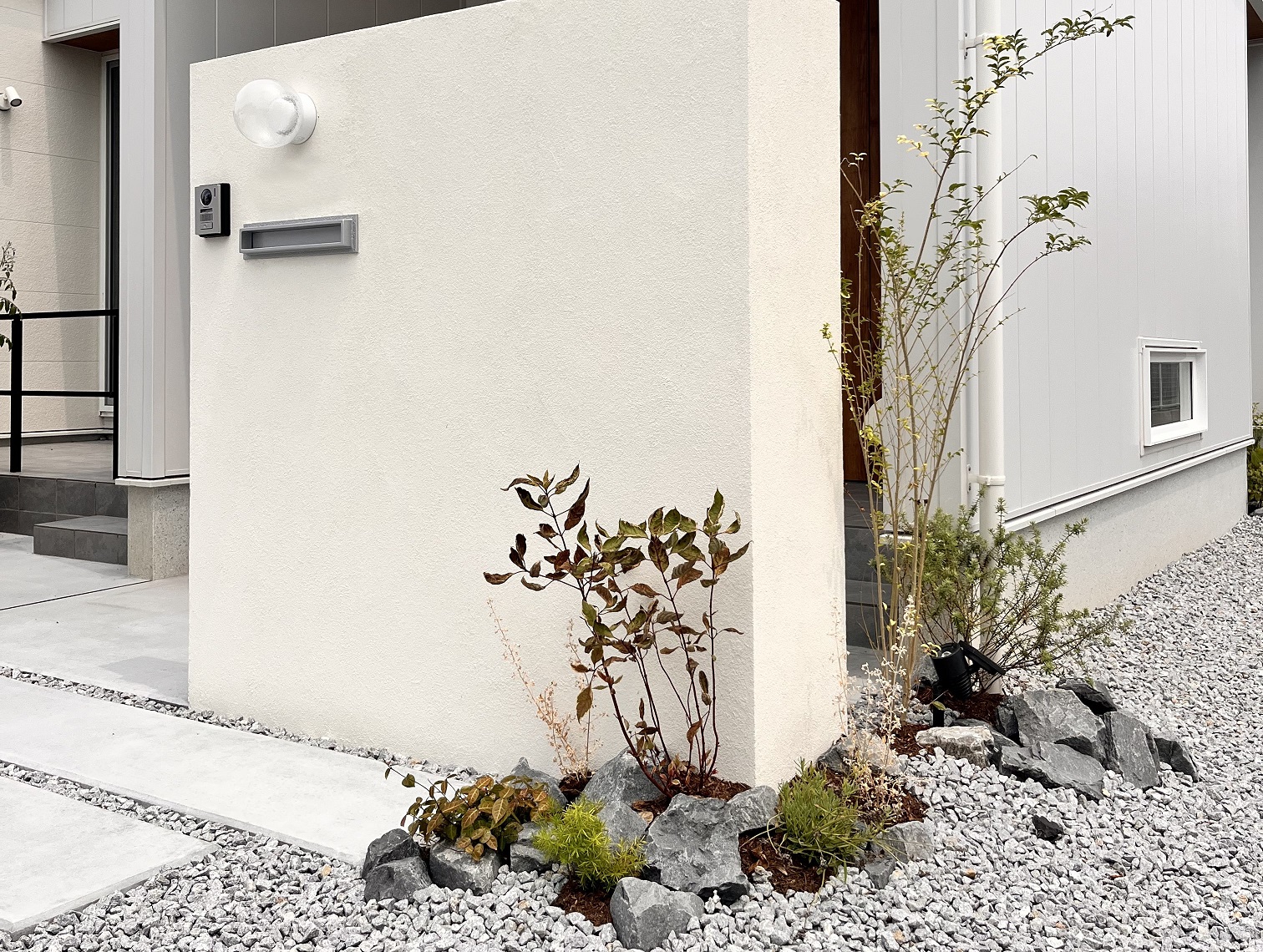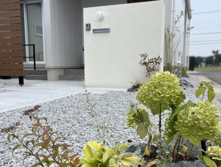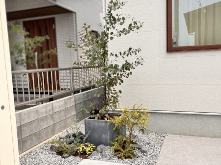 白に映える植栽も彩り豊かに植え込みました。
