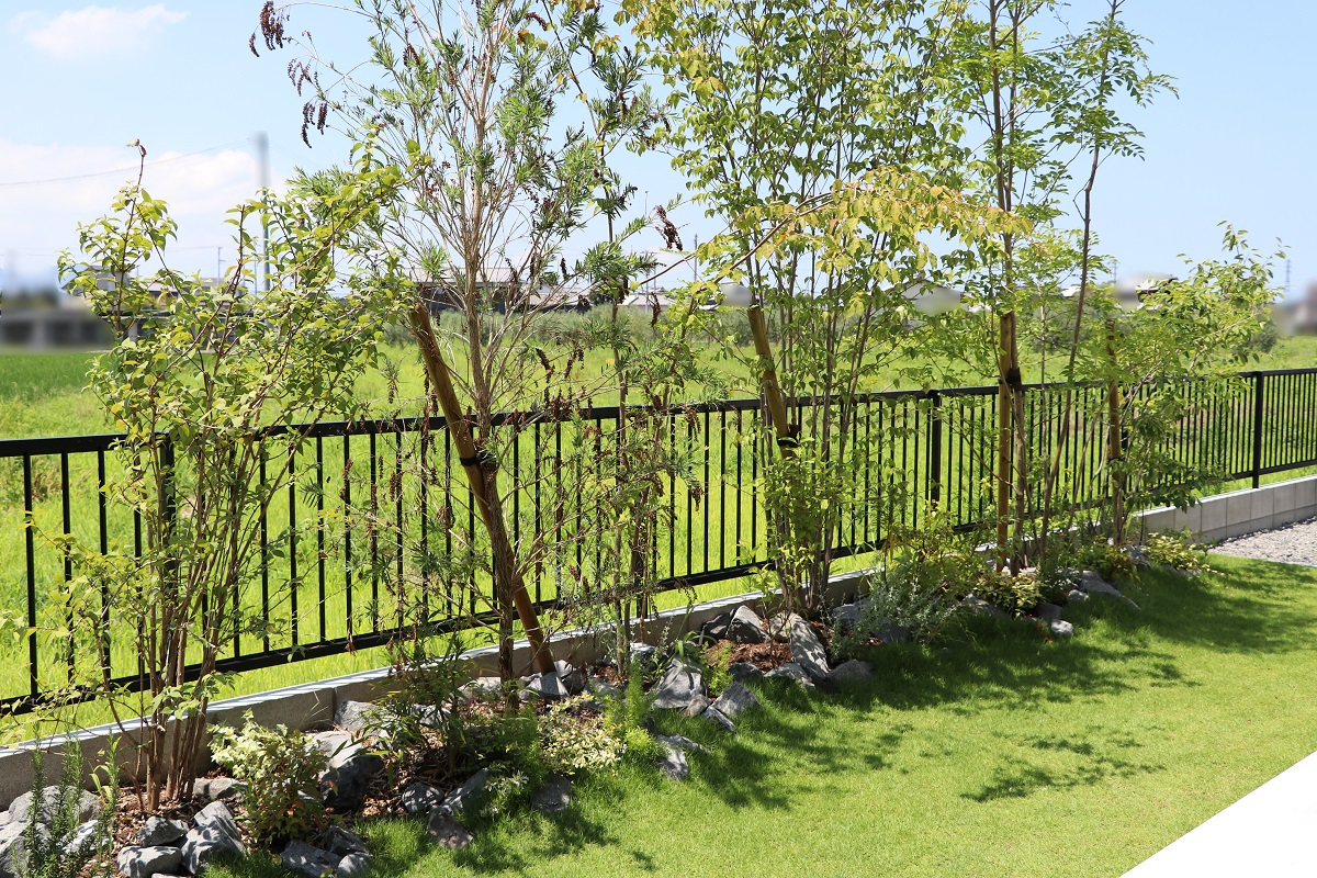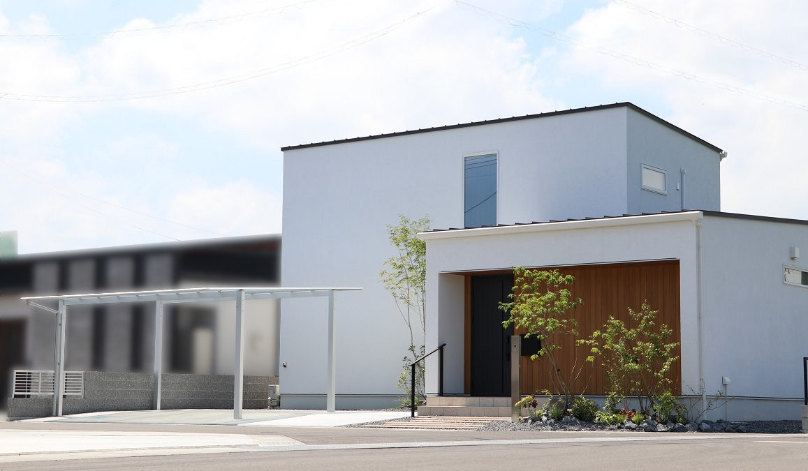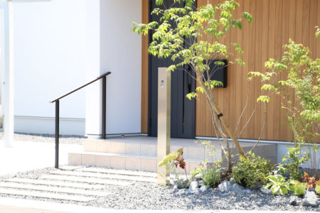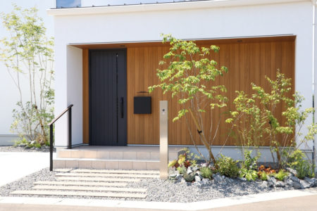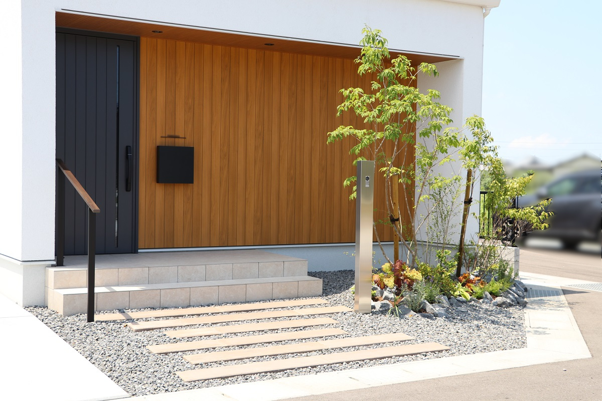 シンプルなエクステリアと豊かな植栽が主役になる、静かで洗練された外構スタイルです。