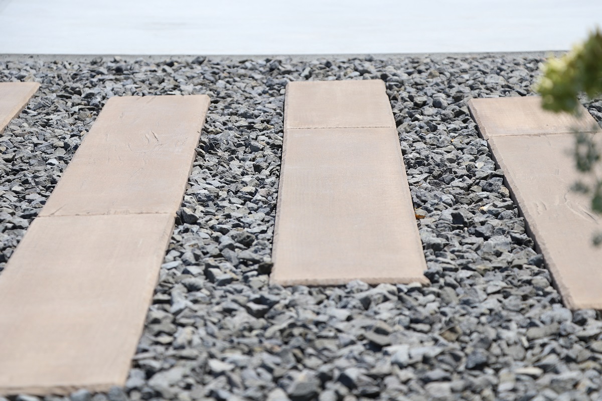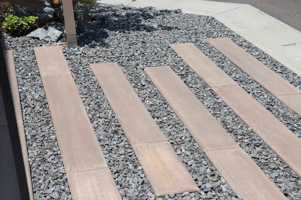 枕木のアプローチとオスポール門柱が、ナチュラルな美しさを引き立てる。