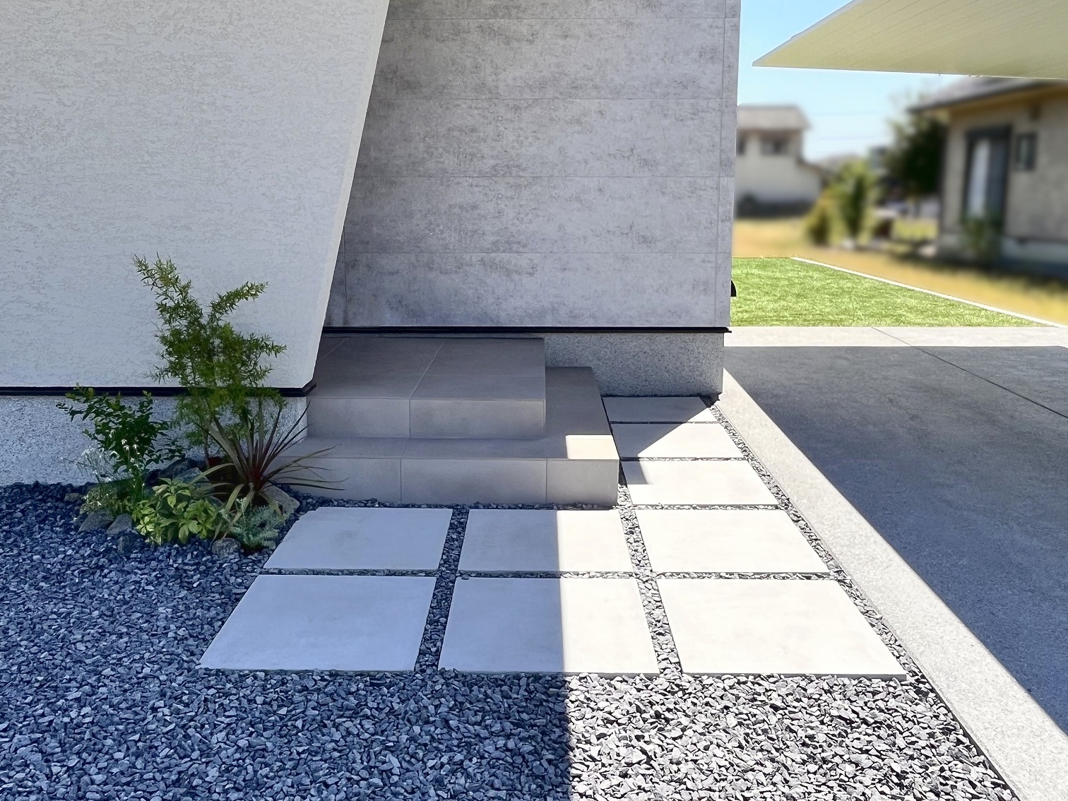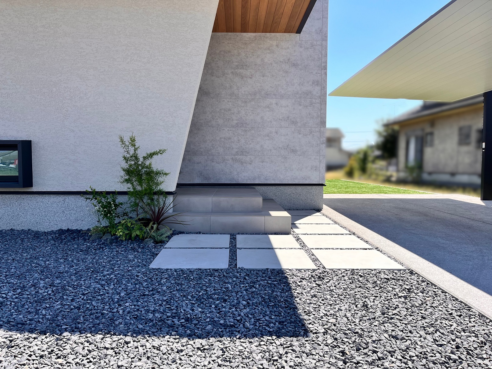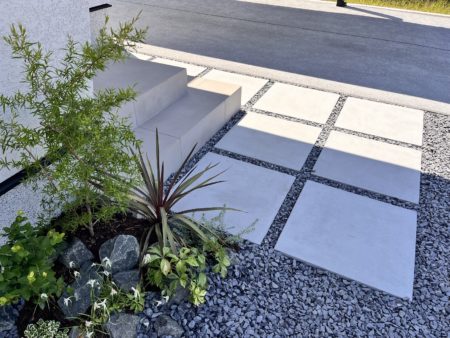 正方形が描く調和のリズムの空間の中で、華やかな姿の異なる植栽が加わり、シンプルでありながら目を惹く存在感のアプローチ