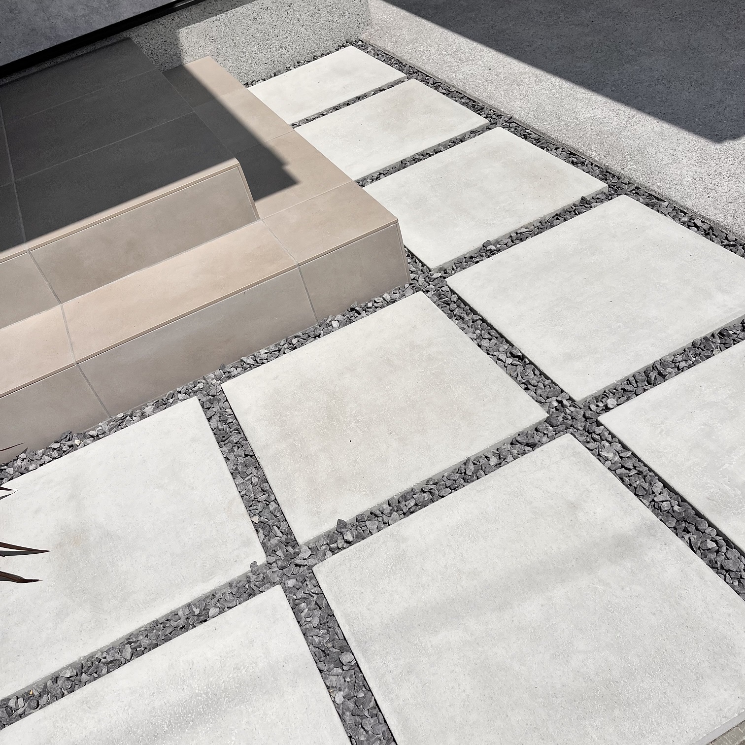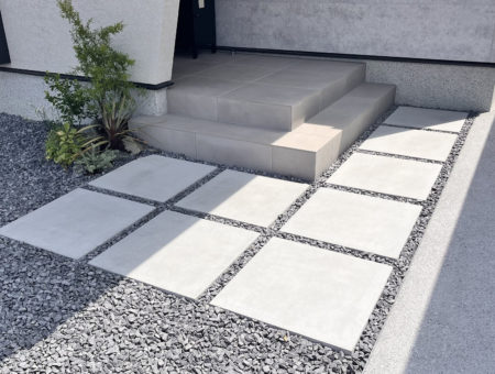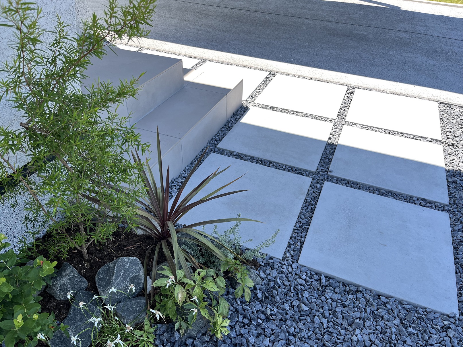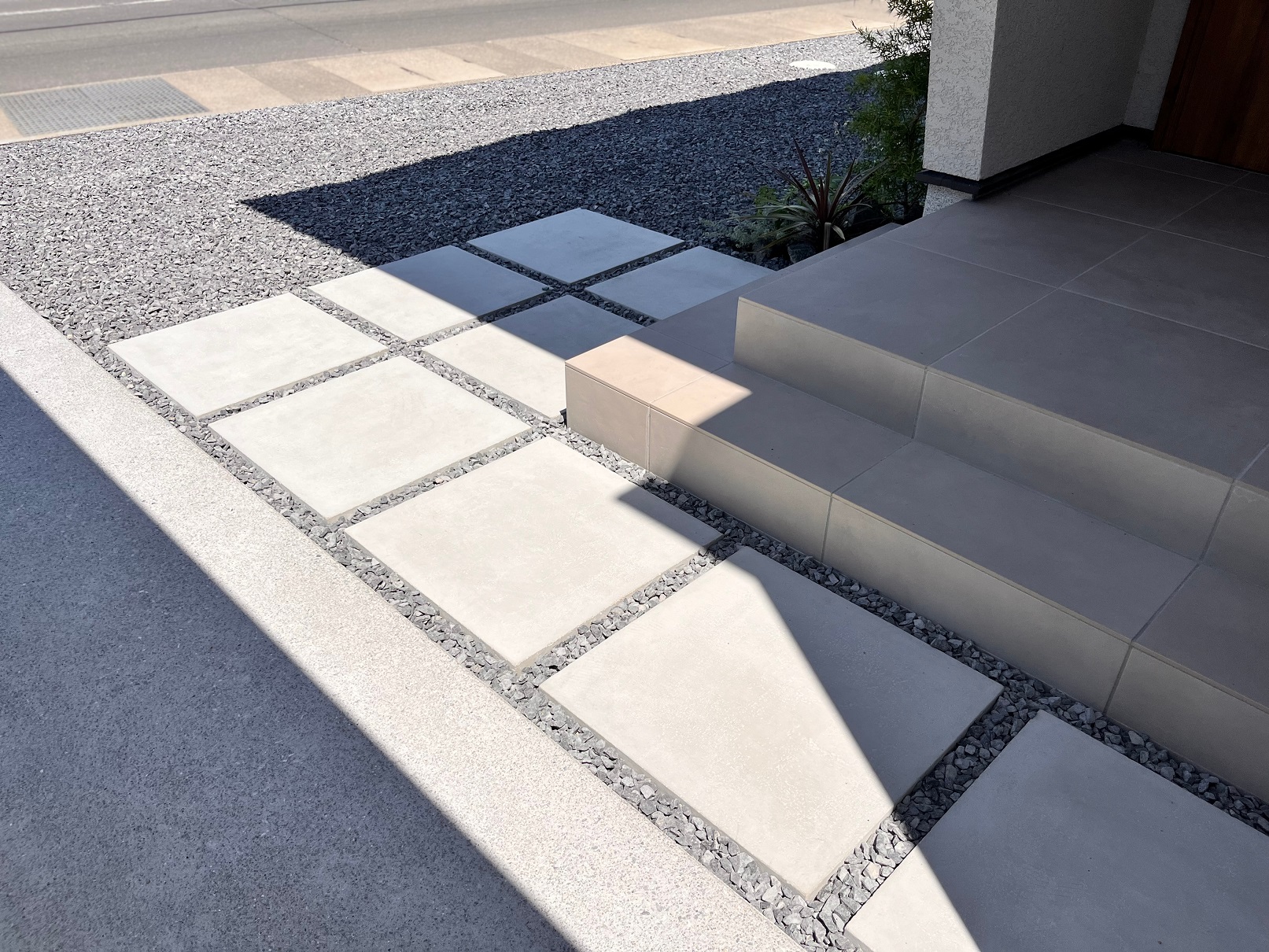 正方形が描く調和のリズムの空間の中で、華やかな姿の異なる植栽が加わり、シンプルでありながら目を惹く存在感のアプローチ