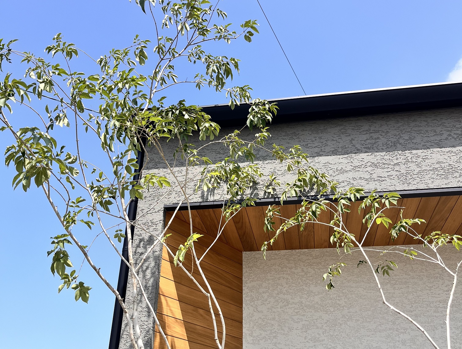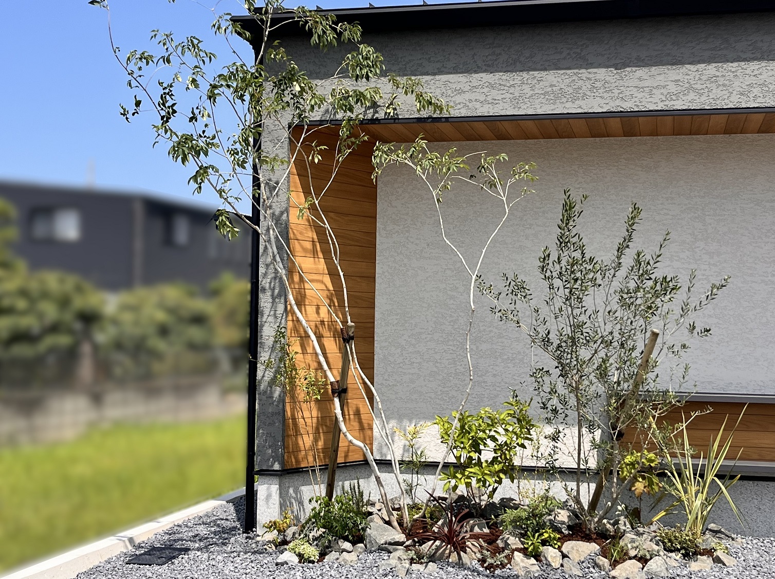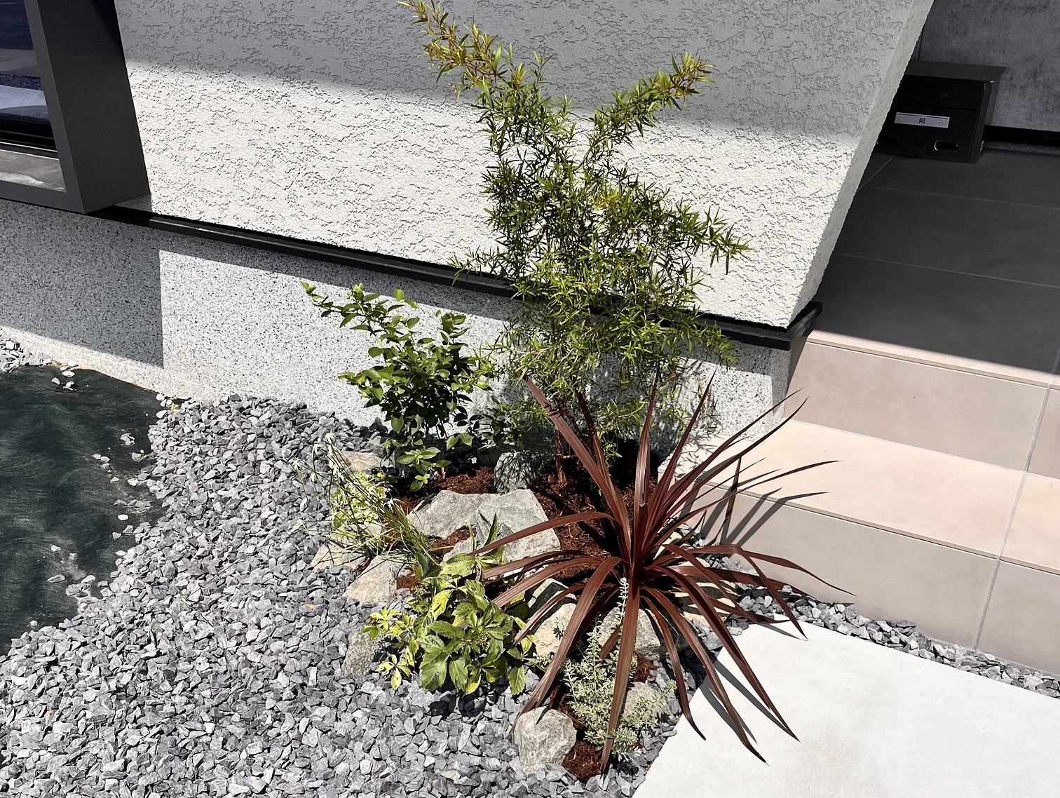 植栽は、建物や外構と調和したりアクセントになったりすることで、景観やデザイン性を高めます。植物の種類や配置によって、シンプル・モダンやナチュラルなどの雰囲気を作ることができます。高さのある植栽やインパクトのある下草を盛り込みました。