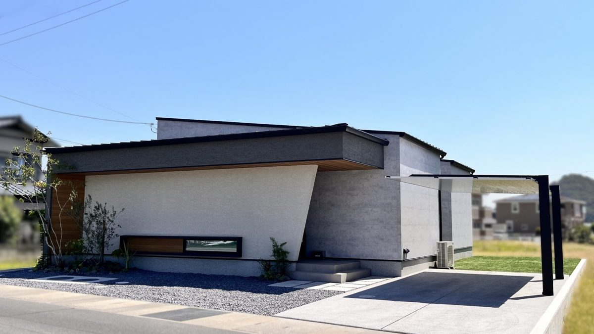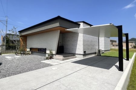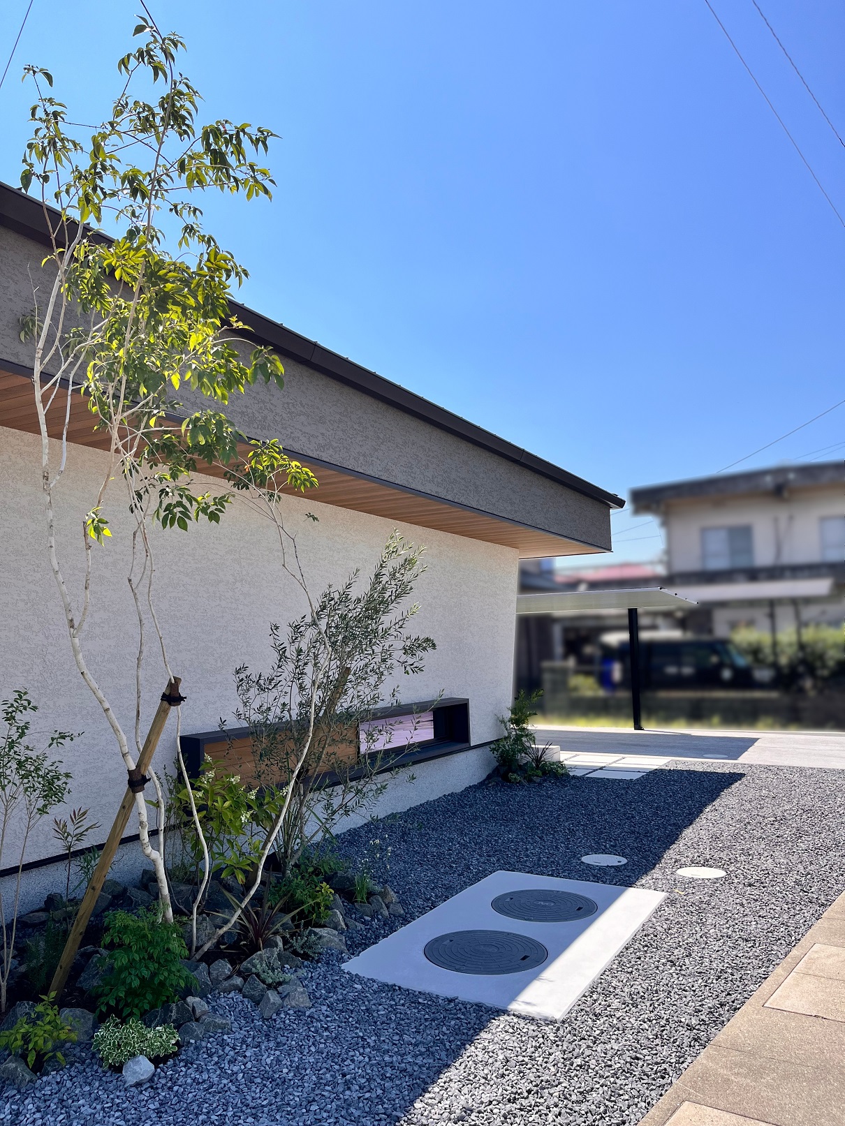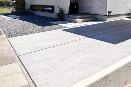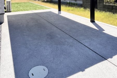 コンクリート土間は洗い出し仕上げで、デザイン性に優れ、タイヤ痕が付きにくく見栄えが美しい仕上がりになり、雨が降った時も滑りにくくなるので、安全対策にひと手間かけた施工の一つです。